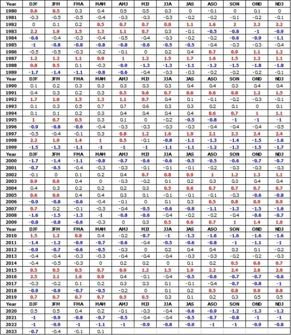 빨간색은 엘리뇨, 파란색은 라니냐이다. 데이터를 보면 엘리뇨가 한두달만 영향을 주는것이 아니다.