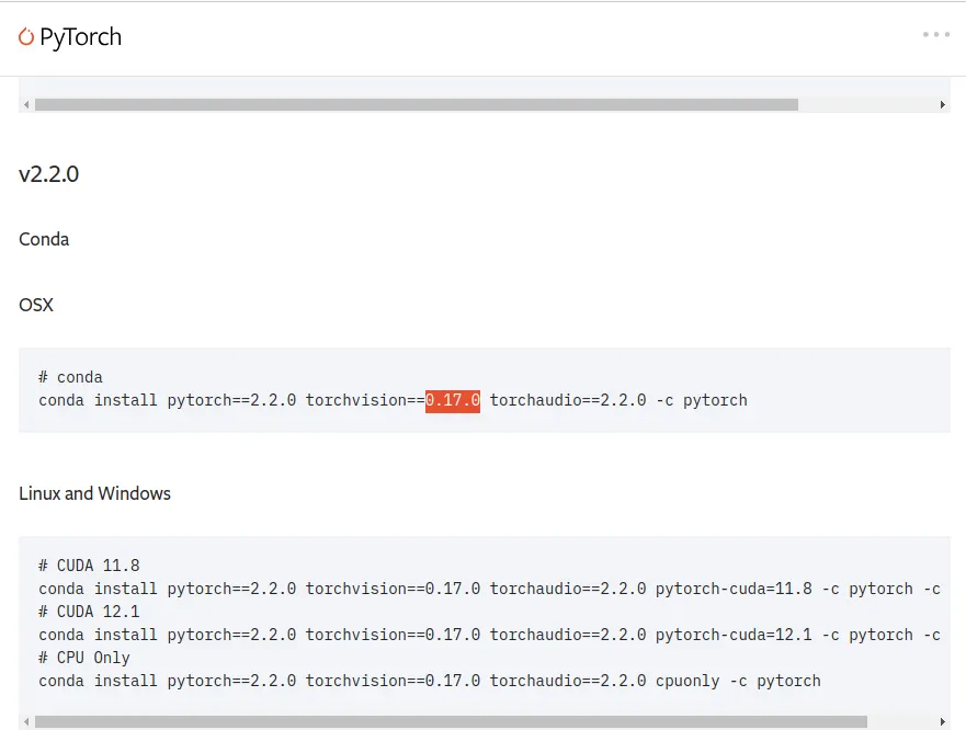 표에 없으면 해당 링크에 들어가서 다운받은 Torch 버전과 맞는 Torchvision 버전을 먼저 확인해주세요!